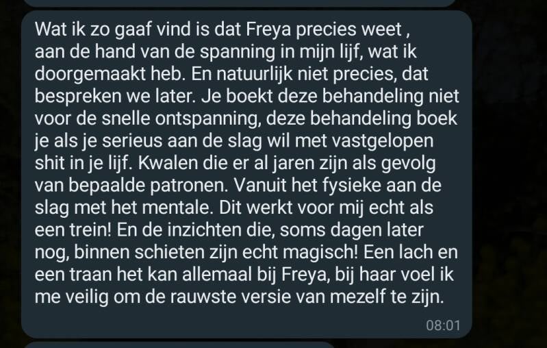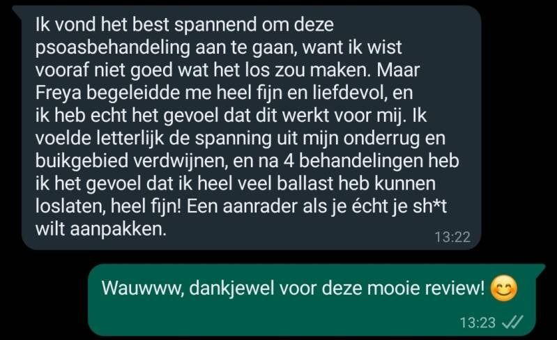 We gaan met dit traject in 3 maanden de spanning die zich in je lichaam heeft opgeslagen loslaten, middels psoas release behandelingen. Daarnaast kijken we naar de emoties en overtuigingen die áchter die spanning zitten, gaan we daarmee aan de slag. En natuurlijk hoort er ook een uur totale ontspanning bij d.m.v. een holistische massage. Tot slot mag je me onbeperkt mailen of appen tijdens dit traject als je tegen lastige situaties aanloopt.